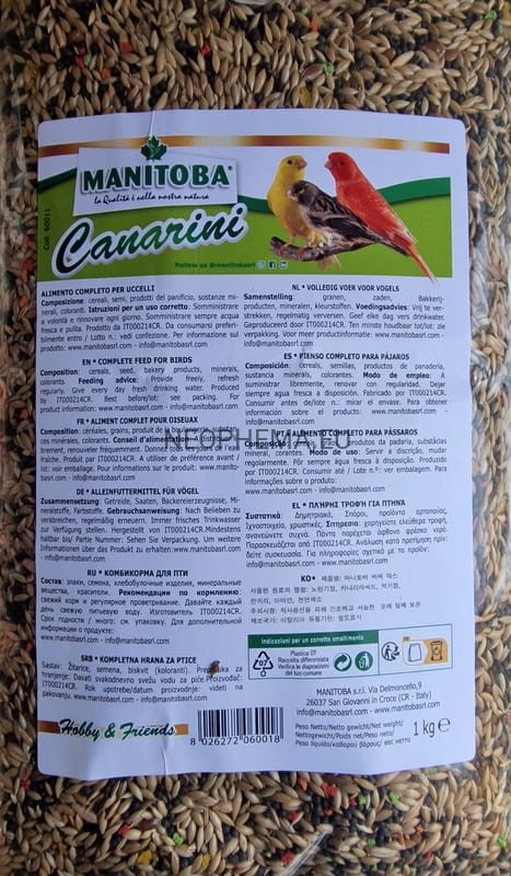 Manitoba stanowi syntezę dziesięcioleci doświadczeń zdobytych przez operatorów w tym sektorze, dzięki szczególnej staranności w doborze zbóż i nasion, od pochodzenia do pakowania, a także ciągłemu poszukiwaniu nowych składników do wprowadzenia do receptury, co pozwala na oferowanie najnowocześniejszych składników odżywczych na każdym etapie hodowli ornitologicznej.