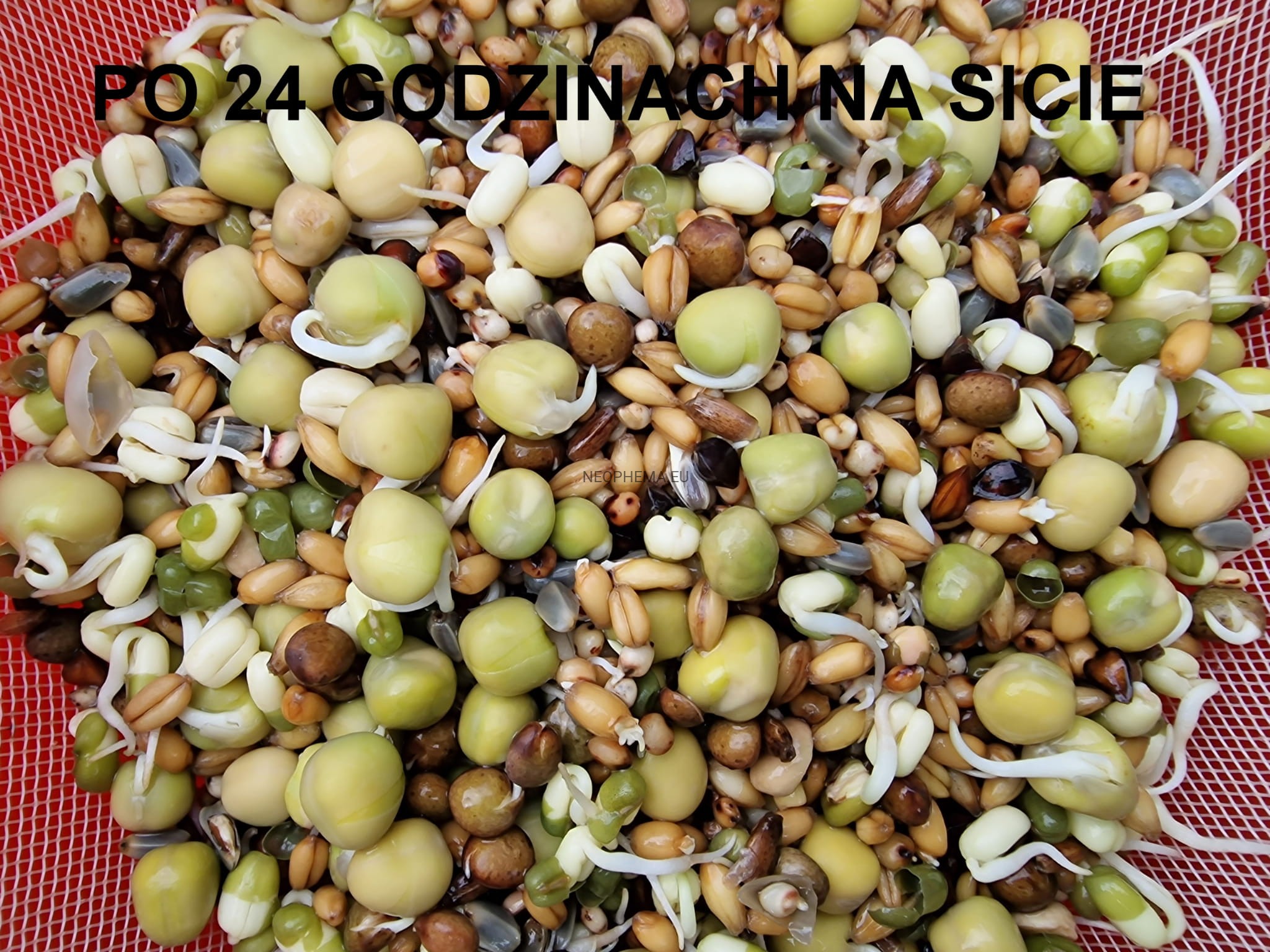 Nasz sprawdzony sposób kiełkowania 24 godzin moczenia dwa raz wymiana wody. Po 24 godzinach moczenia wysypujemy 24 godziny ziarno na sito pod przykryciem przepłukiwane 4-5 razy na dobę pod bieżącą wodą. Największą wartość ziarno ma jak pęka i pokazuje się ząbek.