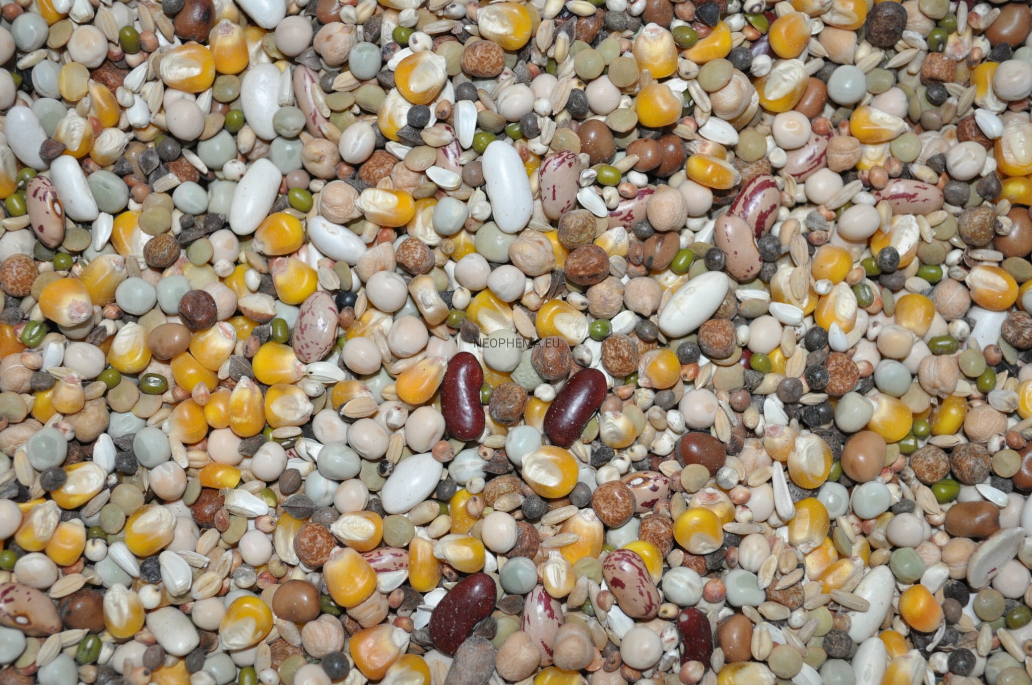 Skład: kukurydza, groszek żółty, groszek zielony, groch klonowy, ciecierzyca, fasola czerwona, fasola biała, fasola nakrapiana, fasola tic, kąkol, soczewica, fasola mung, krokosz barwierski, gryka, milo, dari, ryż niełuskany, łuskany owies, pszenica