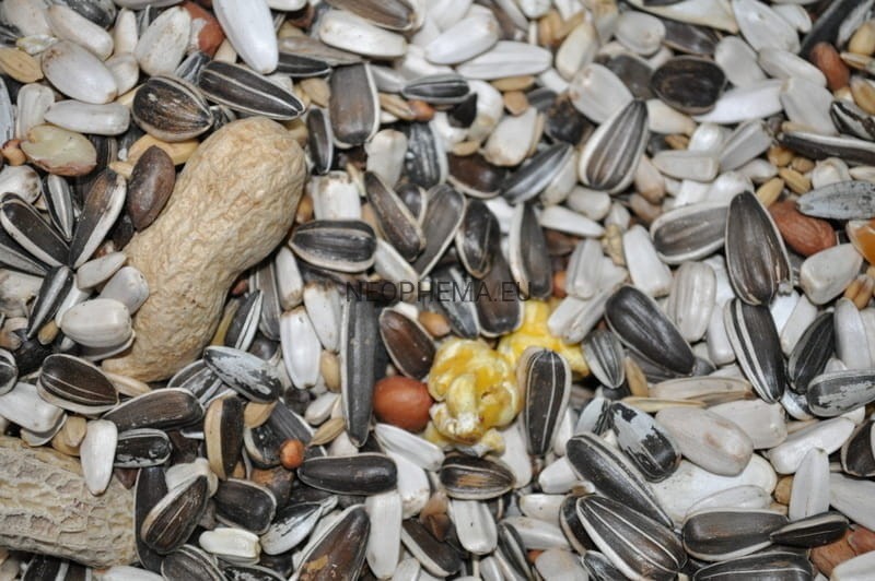 Skład: słonecznik pasiak 25%, słonecznik biały 20%, kukurydza plata 8%, orzeszki ziemne 7%, pszenica 6%, gryka 5%, owies spiczasty 5%, owies łuskany 5%, krokosz barwierski 5%, ryż niełuskany 4%, milo 4%, całe orzeszki ziemne 2%, orzechy cedrowe 2%, popcorn 1%, pestki dyni 1%