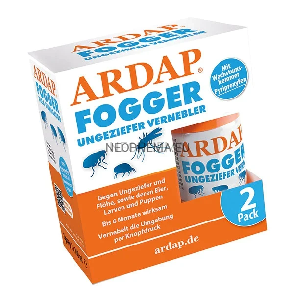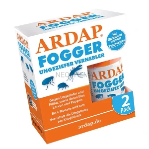 ARDAP Fogger - nebulizator szkodników: 2 x 100 ml ARDAP Fogger niezawodnie zwalcza wszystkie rodzaje much i much, a także inne owady, takie jak kleszcze, roztocza, wszy, karaluchy, ćmy, pająki i inne. Do stosowania w gołębnikach, pomieszczeniach dla ptaków, pomieszczeniach dla zwierząt, gospodarstwach domowych, firmach i rolnictwie. ARDAP Fogger zawiera aktywne składniki permetryny, złocienia i piryproksyfenu oraz butanolan piperonylu jako synergetyk. Permetryna i złocień zabijają szkodniki szybko i niezawodnie, podczas gdy piryproksyfen (inhibitor wzrostu) przerywa cykl rozwoju biologicznego. Tym samym skutecznie zwalczane są wszystkie stadia rozwojowe przez ponad 6 miesięcy. Aby przerwać cykl życiowy pcheł, a tym samym pozbyć się pcheł na dłuższą metę, ważne jest, aby leczyć zarówno środowisko, jak i samo zwierzę. Zaleca się celowe stosowanie preparatu ARDAP o długotrwałym działaniu przeciw pchłom, szczególnie w koszu, lub w ulubionych miejscach psa. Jednocześnie należy również leczyć samego zwierzaka, aby w pierwszej kolejności zapobiec zarażeniu. Na przykład specjalne obroże, spraye lub szampony ARDAP odstraszają pchły ze względu na aktywny składnik złocienia.