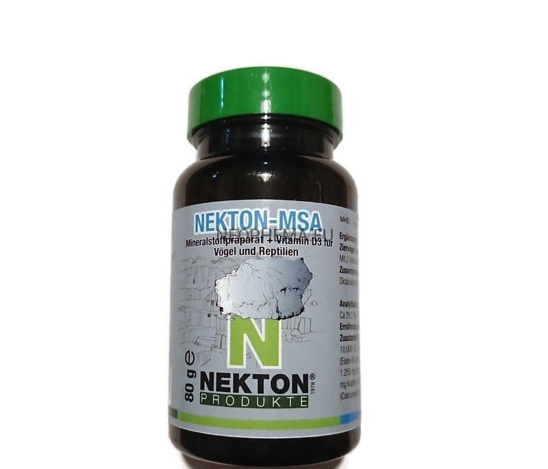 NEKTON-MSA to wysokiej jakości mieszanka mineralna uzupełniona witaminą D3, pierwiastkami śladowymi i aminokwasami. NEKTON-MSA wspomaga i wzmacnia metabolizm i kości, zapobiega krzywicy, aktywuje konwersję minerałów i pomaga zrekompensować uszkodzenia spowodowane niedoborem wapnia. NEKTON-MSA pokrywa rosnące zapotrzebowanie na minerały w hodowli / hodowli, chroni przed złym wchłanianiem, zwiększa obronę przed infekcją i zapobiega łamliwości jaj u ptaków. NEKTON-MSA wspiera dobry rozwój struktur kostnych u młodych zwierząt. Jest to szczególnie ważne dla zwierząt w zapobieganiu późniejszym chorobom spowodowanym niedoborem witamin i minerałów. NEKTON-MSA nie rozpuszcza się w wodzie i można go bez problemu mieszać z miękkim pokarmem lub karmą dla ptaków.