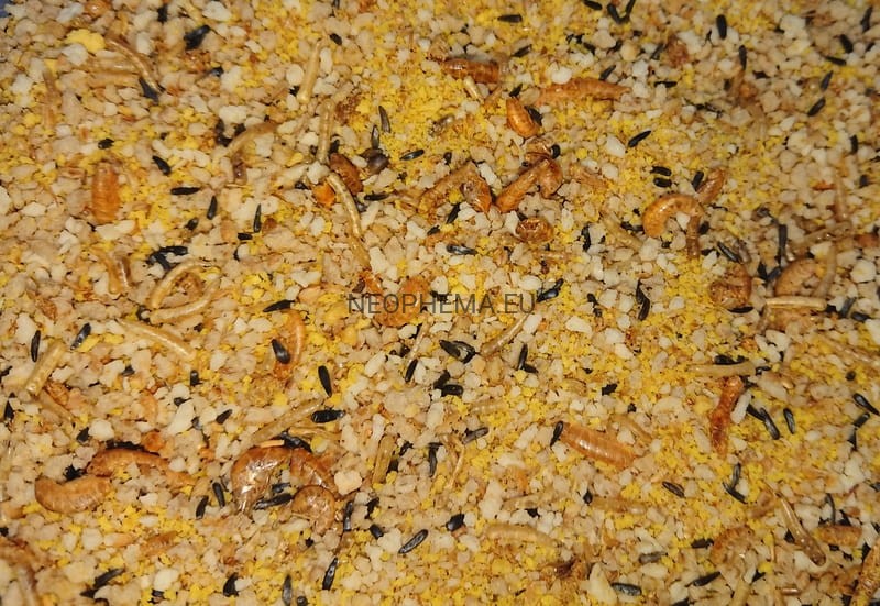 Skład: jaja oraz produkty pochodne z jaj | produkty przemysłu piekarskiego | roślinne ekstrakty białkowe | cukry | nasiona (3,6%) | skorupiaki i mięczaki (gammarus 3,3%) | oleje i tłuszcze | minerały | owady (larwy much 1,4%) | miód | FOS (0,2%) | MOS (0,02%)