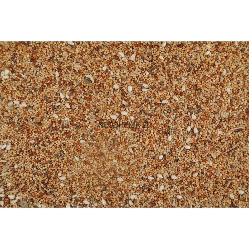 Skład: proso 86% (proso żółte, proso białe, proso czerwone), nasiona lnu, ziarna krokosza, owies łuskany, mozga kanaryjska, ziarna nigru, olej rzepakowy. Składniki analityczne: białko surowe 12,4%, włókno surowe 11%, tłuszcze surowe 5,7%, popiół surowy 2,7%.