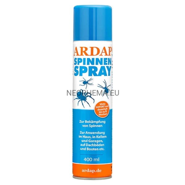 Wysoce skuteczny preparat do zwalczania pająków o natychmiastowym i długotrwałym działaniu do 6 tygodni. ARDAP Spider Spray to środek owadobójczy żerujący i kontaktowy do stosowania przeciwko wszelkiego rodzaju pająkom. Jest również skuteczny przeciwko innym szkodnikom, takim jak muchy, roztocza, karaluchy, ćmy, komary, wszy itp. Idealny w pomieszczeniach takich jak piwnice i strychy, w domkach letniskowych, garażach, domkach mobilnych, na łodziach i w środowisku zwierząt. Spray na pająki ARDAP jest również idealny jesienią, kiedy pająki wycofują się do cieplejszych pomieszczeń. Spray dla pająków ARDAP skutecznie i trwale zwalcza pająki i ich gniazda w domu i okolicy.